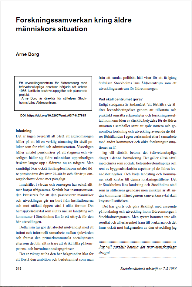 När Stiftelsen Stockholms läns Äldrecentrum grundades 1986 publicerade den första direktören, Arne Borg, en artikel i Socialmedicinsk tidskrift. Där beskriver han vägen fram till Stockholms stads och Stockholms läns landstings (som senare blev Region Stockholm) beslut att starta verksamheten, vad centrumet är tänkt att göra, och hur det kommer att organiseras och finansieras.